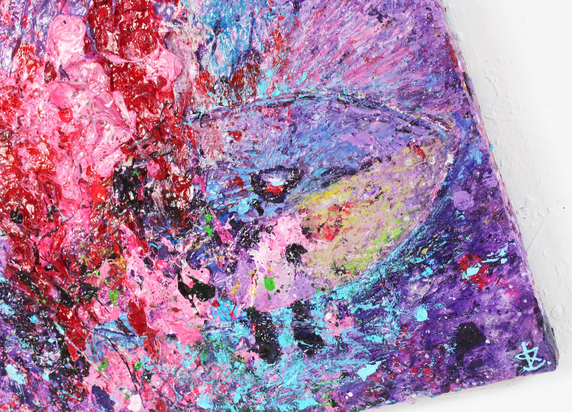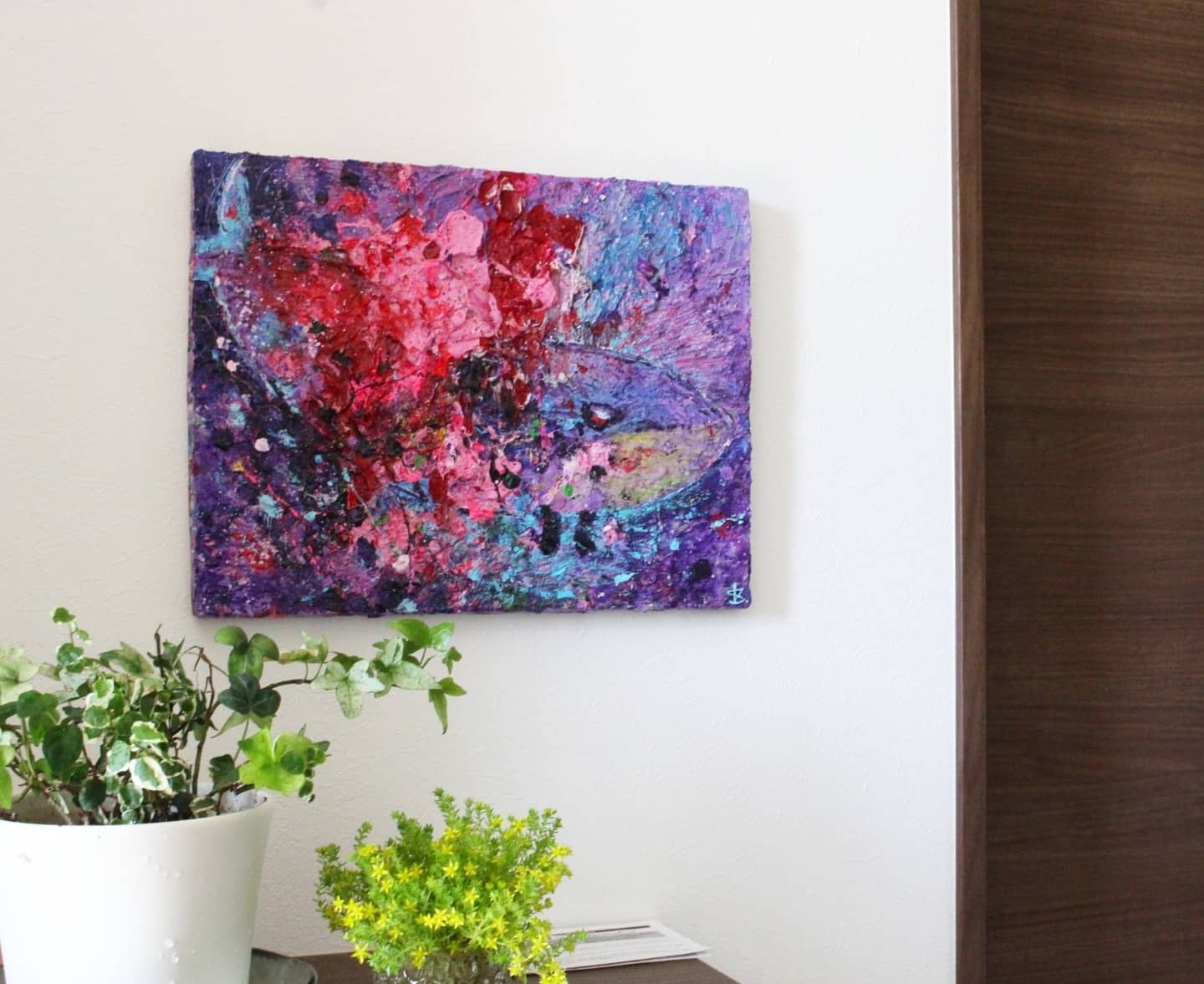“Releasing and going” It jumped into the water Energy was released from the body It'll go like this It'll go all the way in this sea *A whale /acrylic,oilpastel,canvas/31.8×41.0㎝/2020 No frame 『放って進む』 思い切り飛び込んだ からだからエネルギーが放たれた こうやって進む この海をずっと進む 仕様:アクリル絵の具、オイルパステル、キャンバス サイズ:31.8×41.0㎝(F6号)額無し 制作年:2020年 クジラになっている作品。 ------------------------------------------- 植松京子が2020年に制作した絵画です。 原画は一点ものとなっております。 裏面にタイトル、制作年、本人サインあり。 壁に画鋲を刺して、引っ掛けるだけでお部屋に飾れます。 (もっと頑丈にしたい方は、壁に釘打ちをして、 作品の裏両脇にネジで紐を張り、引っ掛けて飾ってください) ------------------------------------------- 【芸術家 植松 京子】 HP: https://kyokouematsu.wixsite.com/artwork Instagram:https://www.instagram.com/kyoko_uematsu_art/ ■作品について 何も計画せず、下描きもせず、キャンバスの前に立つ。 内のエネルギーをものすごく高い状態にする。 ある瞬間から一気に体が動き始める。 次から次へと色が乗っていく。 キャンバス上で絵の具たちが、 目まぐるしくぶつかり、跳ね、飛び散り、流れ、混ざり、消え、削られ、また重なっていく。 途中、目や耳、手や足など、動物に似た生命体の一部を見出す。 そこからは、意識的な動きも加わり、 産まれ出た主役の個性、固有のパワーや可能性が、 最大限に発されるよう、 守りながら、生み出していく。 納得できる姿になったら手を止め、そして改めて対話をする。 この子は何をしているのか。 何を言わんとしてるのか。 どんな心を持っているのか。 それを読み解いてタイトルをつけ、完成とする。 私の絵には、動物ばかりが出てきて、人間は出てこない。 これは、 現代社会において、人間たちが見失いがちな、 「たった“1”の命が持つ可能性、エネルギー」を 純粋な動物たちが、人間に向かって見せてくれている、と捉えている。 この絵を見ている、あなた自身にもこれだけの可能性やエネルギーがあるんだと。 (人間の少女のみたまに出てくるが、これはピュアの象徴として解釈している) いつ何が起こるかわからないこの世の中で、 自分1人、だれか1人、という“1”の力を、純粋な生命力を、信じて 諦めないで生きていきたい。 植松京子