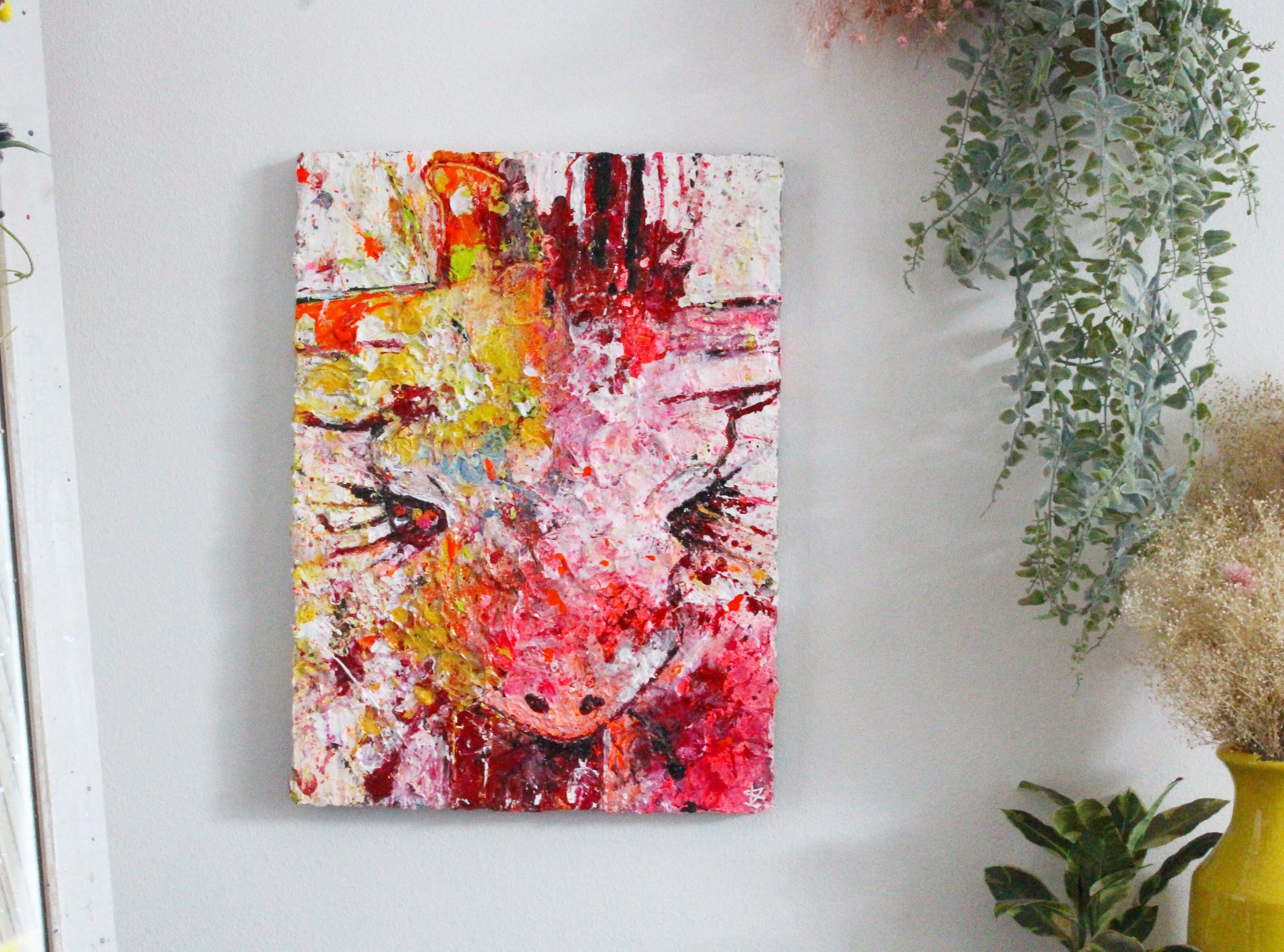 “Warm eternally” OK I'm warm eternally I'll be warm *A face of giraffe acrylic,oilpastel,canvas/45.5×33.3㎝/2020 No frame 『いつまでもあたたかい』 大丈夫 あたたかい いつまでも ずっとあたたかい 仕様:アクリル絵の具、オイルパステル、キャンバス サイズ:45.5×33.3㎝(P8号) 額無し 制作年:2020年 キリンの顔になっている作品。 ------------------------------------------- 植松京子が2020年に制作した絵画です。 原画は一点ものとなっております。 裏面にタイトル、制作年、本人サインあり。 壁に画鋲を刺して、引っ掛けるだけでお部屋に飾れます。 (もっと頑丈にしたい方は、壁に釘打ちをして、 作品の裏両脇にネジで紐を張り、引っ掛けて飾ってください) ------------------------------------------- 【芸術家 植松 京子】 HP: https://kyokouematsu.wixsite.com/artwork Instagram:https://www.instagram.com/kyoko_uematsu_art/ ■作品について 何も計画せず、下描きもせず、キャンバスの前に立つ。 内のエネルギーをものすごく高い状態にする。 ある瞬間から一気に体が動き始める。 次から次へと色が乗っていく。 キャンバス上で絵の具たちが、 目まぐるしくぶつかり、跳ね、飛び散り、流れ、混ざり、消え、削られ、また重なっていく。 途中、目や耳、手や足など、動物に似た生命体の一部を見出す。 そこからは、意識的な動きも加わり、 産まれ出た主役の個性、固有のパワーや可能性が、 最大限に発されるよう、 守りながら、生み出していく。 納得できる姿になったら手を止め、そして改めて対話をする。 この子は何をしているのか。 何を言わんとしてるのか。 どんな心を持っているのか。 それを読み解いてタイトルをつけ、完成とする。 私の絵には、動物ばかりが出てきて、人間は出てこない。 これは、 現代社会において、人間たちが見失いがちな、 「たった“1”の命が持つ可能性、エネルギー」を 純粋な動物たちが、人間に向かって見せてくれている、と捉えている。 この絵を見ている、あなた自身にもこれだけの可能性やエネルギーがあるんだと。 (人間の少女のみたまに出てくるが、これはピュアの象徴として解釈している) いつ何が起こるかわからないこの世の中で、 自分1人、だれか1人、という“1”の力を、純粋な生命力を、信じて 諦めないで生きていきたい。 植松京子