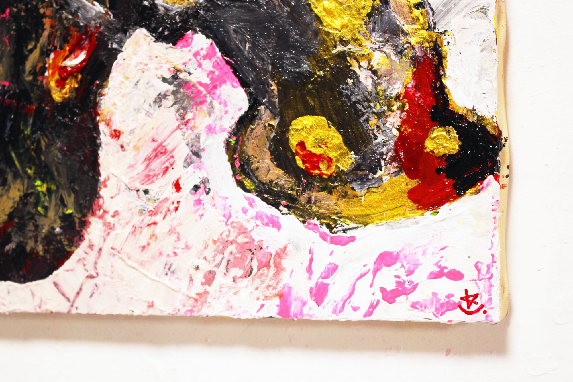 “Existence for being strong” 38×45.5㎝(F8号)額無し キャンバスにアクリル/Acliric on canvas 2017 左の牛が右の牛をにらんでみている。 右の牛は何も気にしていない様子だが、左の牛にとっては魂を燃やすほどだ。 ライバル視する存在は、自信を強くするために必要なのではないか。 ライバルもわるくない。